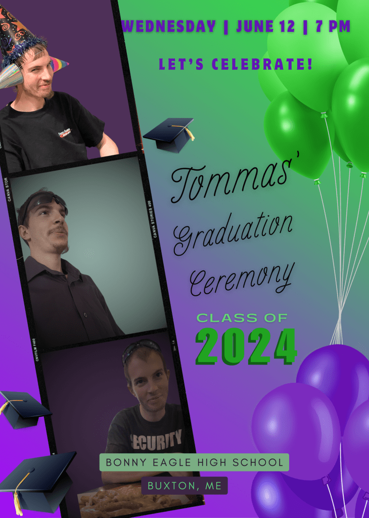 As many of you know, Tommas has been working hard to get his GED. He did exceptionally well and is set to graduate on June 12th from Bonny Eagle High School. I created invitations that were sent out virtually. This design was created with the idea of mixing the graduation theme with Tommas. His favorite colors are purple and green so I added with with the celebratory balloons icons as well.